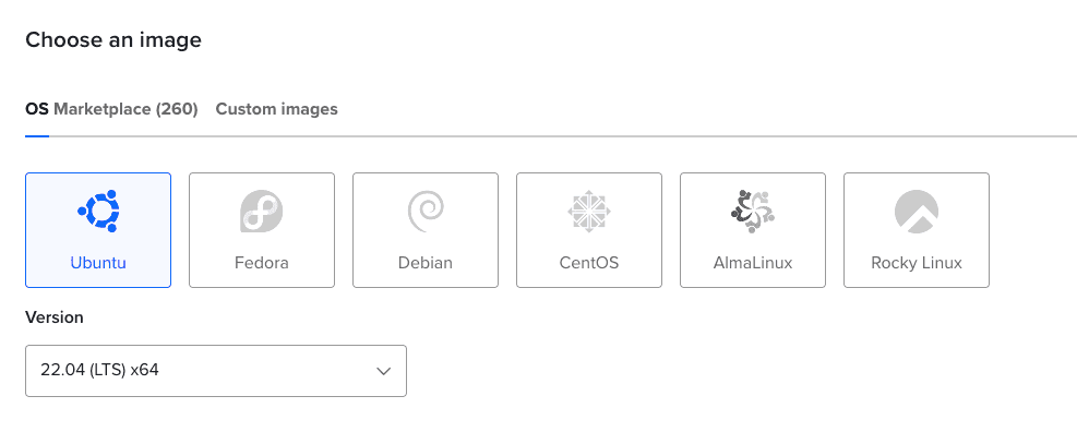 - Select an OS: I prefer Ubuntu with the latest LTS version, 22.04 at the time of writing.